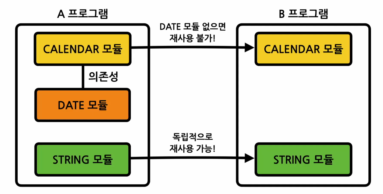 - 다른 모듈에 의존성이 없을 시 독립적으로 재사용이 가능