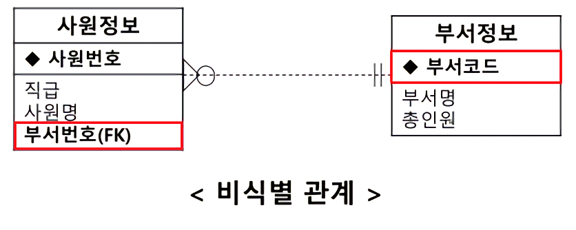 - 아래 그림에선 자식 엔티티(사원정보)가 부모 엔티티(부서정보)의 부서코드를 일반 속성으로 두었다.