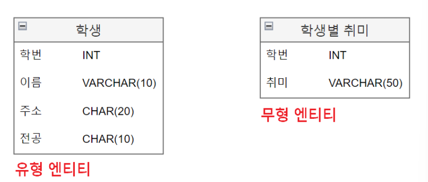 | 유형 엔티티 | 물리적인 형태 (예 : 고객, 상품, 거래처, 학생, 교수 등) |