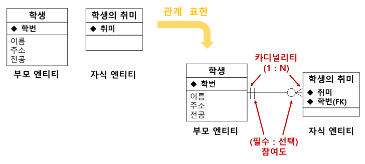 - 아래 그림에선 자식 엔티티(학생별 취미)가 부모 엔티티(학생)의 학번을 자신의 주 식별자로 설정