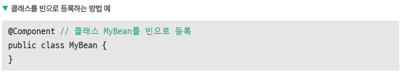 MyBean이라는 클래스에 @Component 애너테이션을 붙임 → MyBean 클래스가 빈으로 등록