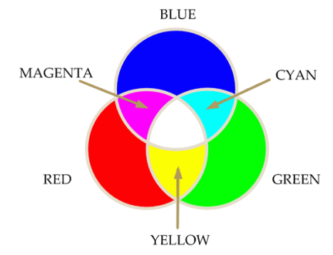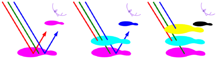 - R+G = Y, G+B = C, B+R = M