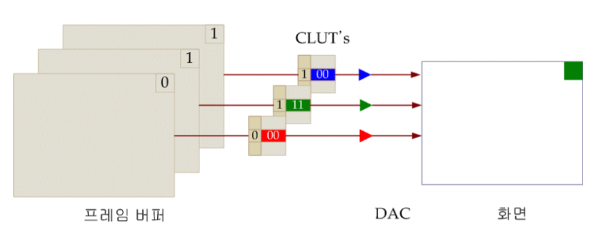- 프레임 버퍼 내용은 CLUT (Color Lookup Table, 컬러 보기표)의 인덱스