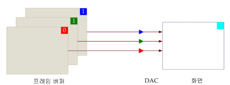 - 프레임 버퍼 내용이 직접적으로 R, G, B 값을 담고 있어, 색 결정