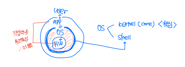 → OS는 kernel과 shell 부분으로 나뉨- → 하드웨어가 application을 직접적으로 실행시킬 수 없어 OS가 필요