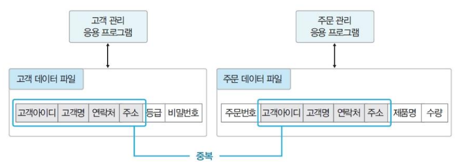 - 같은 데이터가 여러 파일에 중복 저장 → 데이터 중복성