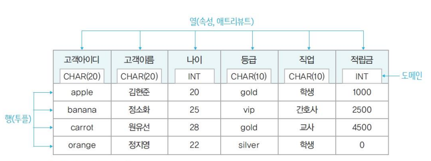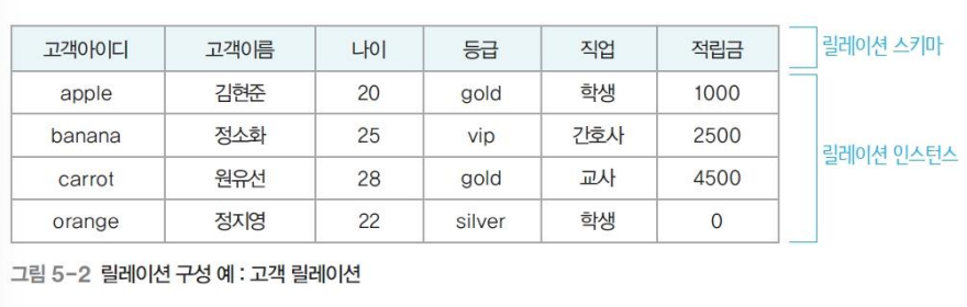 - 개체에 대한 데이터를 2차원 테이블 구조로 저장