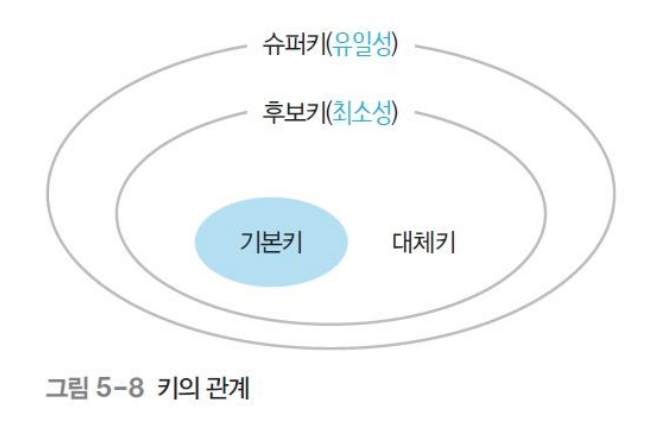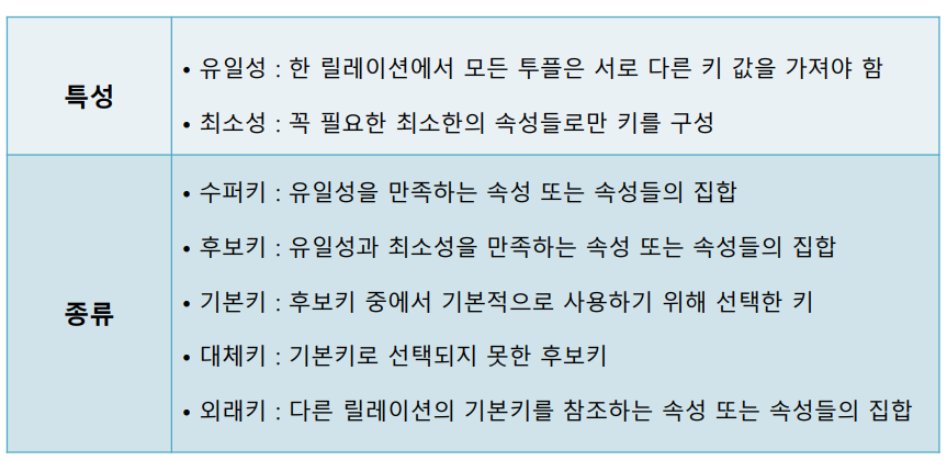 - 기본키, 후보키, 대체키, 슈퍼키, 외래키