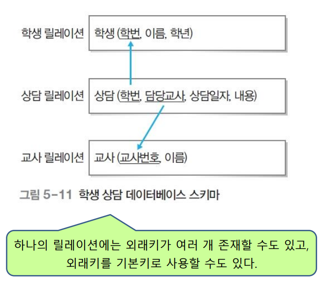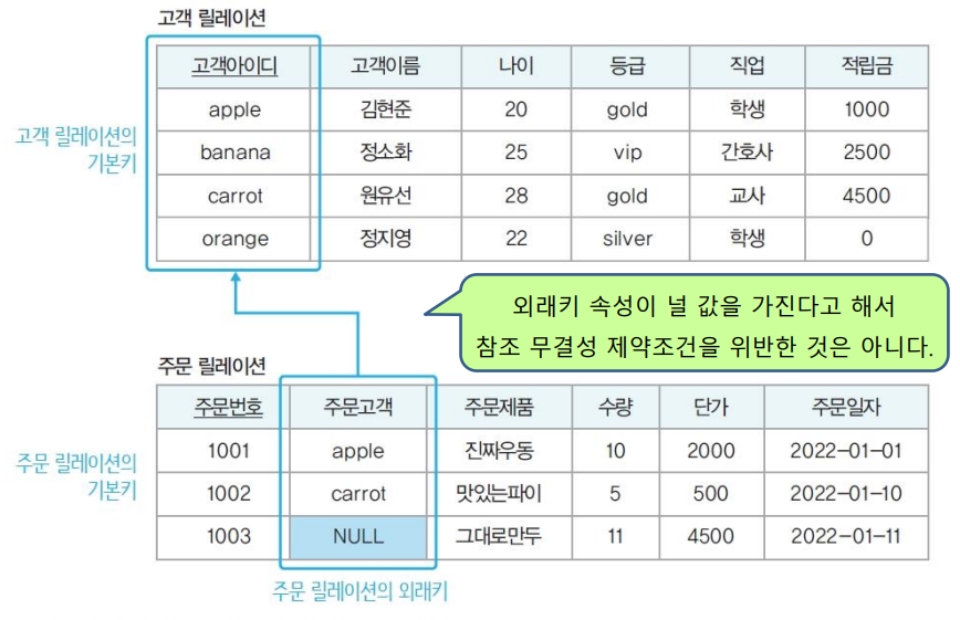 - 참조되는 릴레이션 : 외래키가 참조하는 기본키를 가진 릴레이션