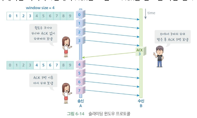 - if 윈도우 크기 4 → ACK 없이도 4개 프레임 연속으로 보낼 수 있음