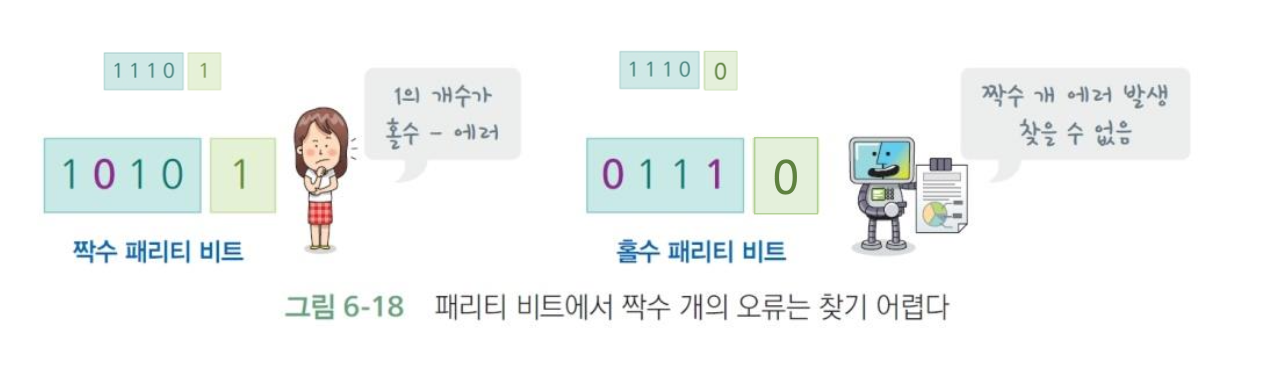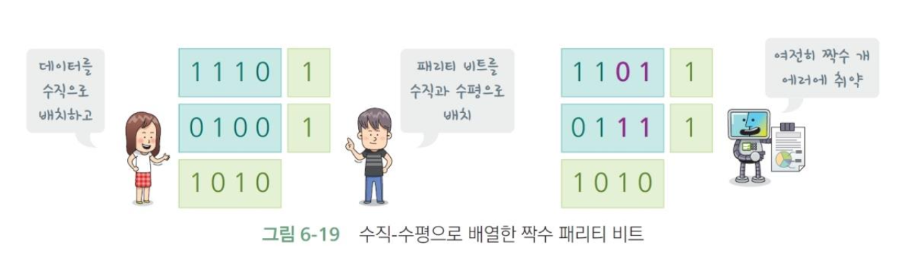 - 따라서 패리티 비트는, 추가되는 1비트당 1개의 에러 찾기 가능