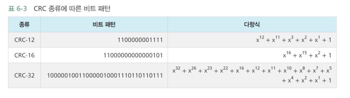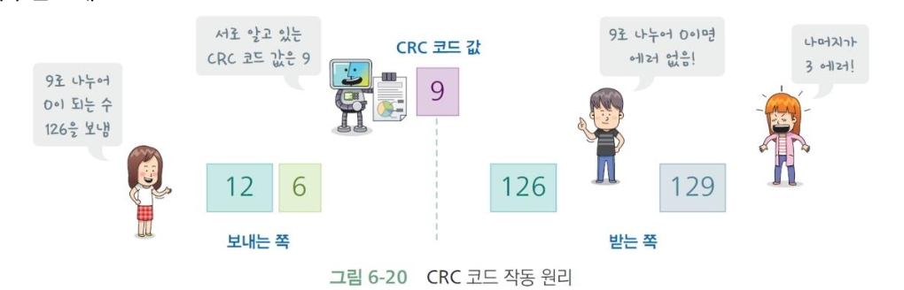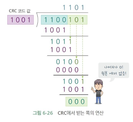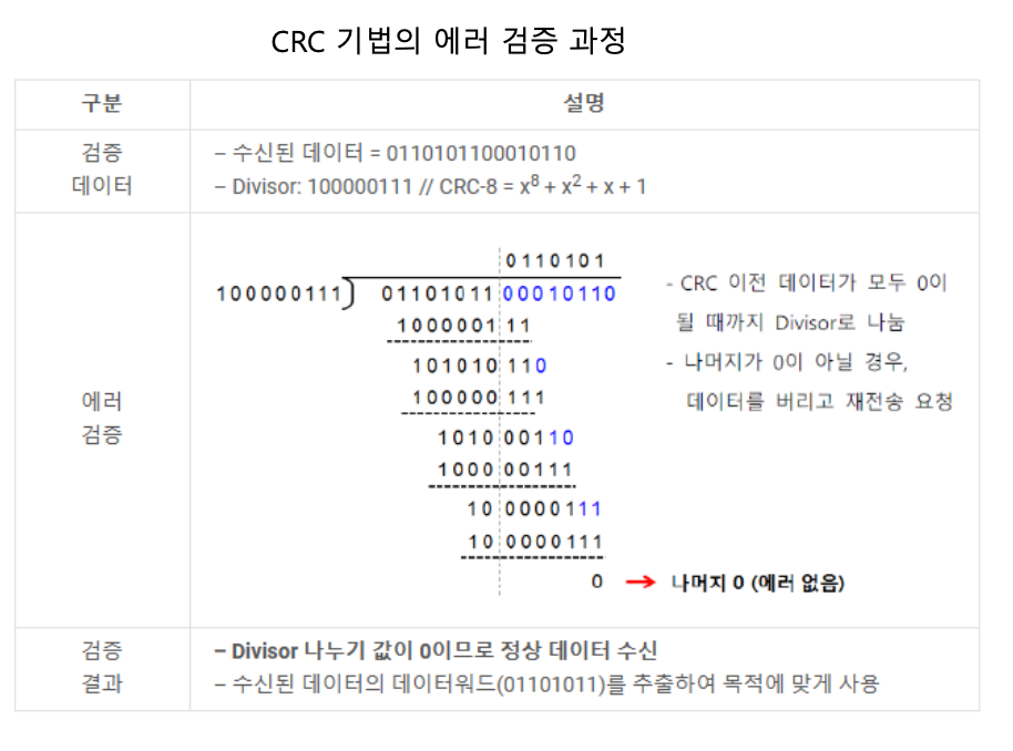 - 보내는 쪽에서 데이터를 CRC 코드 값으로 나누었을 때 나머지가 0이 되게 숫자 추가해서 보냄