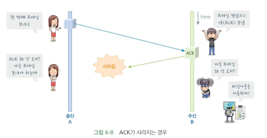 - 수신 B가 프레임 받고 ACK 했는데 ACK이 사라짐